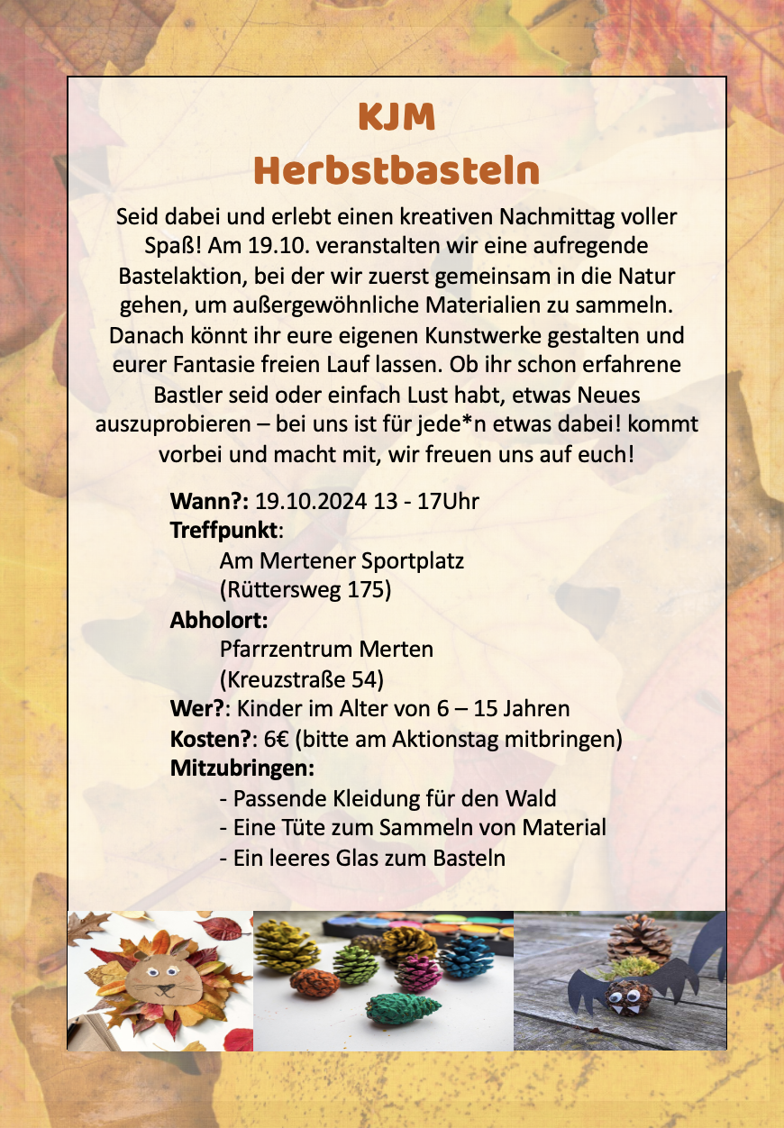 Am 19.10. veranstalten wir eine aufregende Bastelaktion, bei der wir zuerst gemeinsam in die Natur gehen, um tolle Materialien für eure Projekte zu sammeln. Danach könnt ihr eure eigenen Kunst- werke gestalten und eurer Fantasie freien Lauf lassen. Ob ihr schon erfahrene Bastler seid oder einfach Lust habt etwas Neues auszuprobieren – bei uns ist für jede*n etwas dabei!